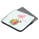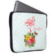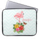 Bolsa de laptop com uma ilustração digital fofinha apresentando um flamingo rosa com uma perna erguida. Em pé sobre um buquê de flores e folhas de hibisco tropicais. Uma borboleta bonito está pairando ao redor das flores.