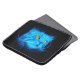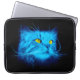 Um rosto de gato azul fraturado com olhos amarelos espantosos contra um fundo preto.