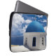 Bolsa de laptop com Santorini, foto de Grécia com céu azul e nuvens brancas.