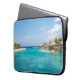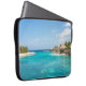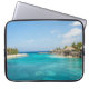 A laptop sleeve with a beautiful photo featuring a tropical beach resort.