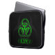 Esta bolsa de laptop preta apresenta o símbolo internacional do perigo biológico: o trifoil do risco biológico! Este logotipo está brilhando com uma misteriosa aura verde, assim como a palavra "BIOHAZARD" embaixo dela. O fundo apresenta uma representação maior do símbolo de risco biológico em cinzas escuras.