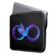 Símbolo luminoso, roxo e infinito com beija-flor azul voadora, luminosa, em fundo preto. Neon.