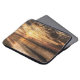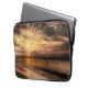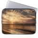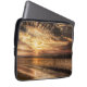 Foto impressionante da paisagem do nascer do sol sobre uma praia com um dramático céu nublado em contraste com a água calma.