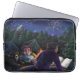A arte Starry Night de Traci Van Wagoner impressão, posters, acessórios e presentes mostra nossa pintura original de duas crianças e seu grande e negro cão acampando sob as estrelas lendo um livro fantástico ao redor de um fogo no acampamento sobre cavaleiros e dragões. A magia da história está subindo no céu estrelado para mostrar um cavaleiro e um dragão numa dança eterna noturna de estrelas. Aproveite um acampamento noturno de verão nas montanhas.