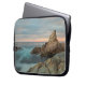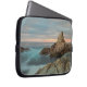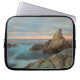 Uma fotografia impressionante captura uma linha de costa robusta no pôr do sol. A imagem apresenta uma grande ascensão de formação de rochas jagadas a partir da água, com uma rocha menor no primeiro plano. O sol de fixação lança um brilho quente no horizonte, enquanto o céu acima é uma mistura de cinzas macios e nuvens cor-de-rosa. A água é uma turquesa vibrante, com longas e fluidas criadas pelo movimento das ondas.