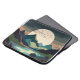 Uma paisagem abstrato de uma enorme superlua em uma cena de lago montanhês com um bando de pássaros em texturas ousadas e tons escuros de marrom, bege, bronzeado, azul, ciano e preto.