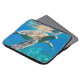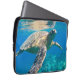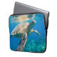Fotografia subaquática de uma tartaruga marinha nadando em água cristalina logo abaixo da superfície.