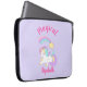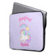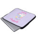 Uma bolsa de laptop personalizada com um adorável unicórnio branco com mané e cauda verde-pastel, roxo, amarelo e rosado. Esta criatura mágica está deitada dormindo pacificamente com uma estrela cadente colorida no arco-íris voando sobre sua cabeça. O texto diz "Mágico" em uma fonte de tendência rosa. Púrpura e fundo branco de bolinhas pastel.
