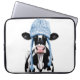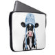 A ilustração apresenta uma vaca negra e branca vestindo um chapéu azul de inverno com tocas e cordas trançadas. A imagem combina elementos da vida no campo com uma reviravolta humorística, retratando a vaca num estilo inesperado, que acrescenta um encanto único à imagem.
