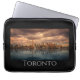 Linda fotografia cênica de Toronto, Canadá com nuvens de cinzas, o horizonte da cidade e um reflexo de tudo isso na água. Borda preta com sobreposição de texto branco.