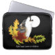 Um lobo uivando numa lua de cheio com folhas de outono e bolotas contra um pano de fundo de preto.