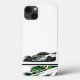 Esta capas de iphone é mostrada em uma cor branca com uma impressão de arte de carros de corrida automotiva. Personalize este item ou comprar como está. Imagem do stock vecteezy.com