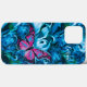 Personalize esta capas de iphone única de borboleta "Um tipo"! Ela apresenta uma borboleta rosa, azul e negra voando entre lindas flores azuis e azuis escuras! Pintura de arte original do artista Kerry Miller.