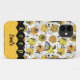 Fundo branco com um padrão de colmeia de abelhas e um sorriso feliz de abelhas. Decorado com formas amarelas de alveoleiro no fundo. Personalize e adicione seu texto em hexágonos ouros e pretos.
