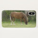 Esta capas de iphone fantástica apresenta uma bela fotografia de um lindo cavalo castanho castanho, de cor castanho, com um homem e pés brancos brilhantes. O cavalo está pastoreando uma grama verde curta em um campo.