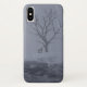 Uma paisagem 3D fria e ventosa no inverno, criada em Vue. Em cima de uma colina branca com gelo e neve, contra um céu de cinza tempestuoso com chuva ou manga caindo firmemente, uma árvore de bordo solitária e nua se posiciona com um banco de madeira embaixo dela.