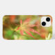 No cenário das folhas verdes de verão de um ácer japonês que fluía para vermelhos e amarelos do outono, uma folha de esqueleto de rosa e ouro desce lentamente para o chão.