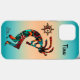 Personalize esta única Capa de telefone de células do sudoeste de Kokopelli! Ele apresenta um Kokopelli tocando a flauta e dançando sob o sol em um fundo de turquesa e sunset laranja! Design de Arte Gráfica Original criada pelo Artista Kerry Miller.