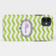 Esta capas de iphone verde e branca tem um aspecto tridimensional devido ao design de cor de duas sombras. É uma ilusão óptica que faz com que este padrão quevron seja pop! A cor é 'tiros macios'. Dentro o quadro de estilo antigo é um lugar para o seu nome. Você pode escolher seu estilo de telefone. Clique também em "Alterar texto" para adicionar seu nome ou outra personalização, como um ditado inicial ou favorito.