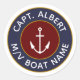 Capitão personalizado com o seu nome e nome do barco, com autocolantes náuticos de ancoragem. Símbolo azul clássico de marinho e marrom redondo com âncora branca, bordas de texto e douradas sobre fundo branco.