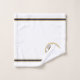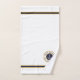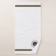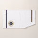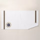 Capitão personalizado com o seu nome e nome do barco com o toalha de logotipo da âncora náutica. Simulação do círculo clássico com campos de ancoragem e texto em azul-marinho, branco e ouro sobre fundo branco. Marinho azul e borda listrada dourada no topo e no fundo.