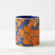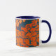 Caneca branca com jante azul escura e alça, decorada com peixes laranja impressos com tela sobre fundo azul escuro