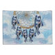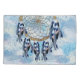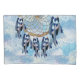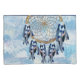 Um apanhador de sonhos que inclui o círculo redondo de bambu e miçangas vermelhas na teia com penas exóticas de pássaros-papagaios azuis em um fundo de pena de blues macio