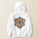 "Um capuz feminino acolhedor e vibrante com um padrão tribal laranja e marrom único. Perfeito para crianças ativas que amam roupas artísticas e coloridas."