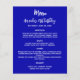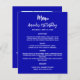 Um fundo azul real. Texto branco. Frente: personalize e adicione seu nome, data e menu. Adicione sua própria foto e fatos divertidos sobre a garota de aniversário. Remova os nomes se não for necessário. 1 folha = 1 menu impresso borda a borda.