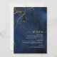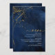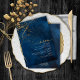 Um fundo de aquarela em tons que variam do azul real ao azul-marinho é encimado por um desenho abstrato de finas linhas douradas e efeitos de iluminação cintilantes para criar as peças deste belo conjunto de casamento. O cartão do 'Cardápio' de casamento mostrado aqui também apresenta caligrafia elegante e um layout descentralizado para apelo visual. É fácil adicionar suas próprias iniciais, data de casamento e seleções de cardápio usando o modelo fornecido. Procure por ID867 para ver outras peças e opções de cores para este conjunto.
