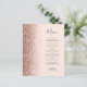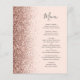 A borda esquerda deste elegante cardápio de casamento moderno apresenta uma falsa borda de brilho rosa dourado. O texto personalizável combina fontes de caligrafia manuscrita caprichosa cinza carvão e cobre em um fundo rosa bege. O verso apresenta um design correspondente de brilho rosa e dourado.