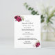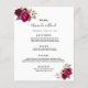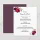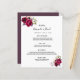 Um cartão de menu de casamento estilo boêmio boho elegante. Rosas exuberantes pintadas à aguarela, em rosa e burgundy. Modelos para seus nomes, data e cardápio de casamento. Fundo branco na frente, cassis, roxo profundo no verso. Letras pretas.