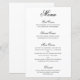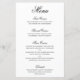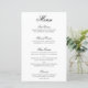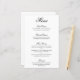 Cardápio de casamento de estilo elegante e clássico com um design simples com "menu" e os títulos das seções em caligrafia preta formal e descrições dos pratos em uma fonte serifada sobre um fundo branco. Um design tradicional e sofisticado que é perfeito para um casamento de gala. Esses cardápios de casamento baratos são impressos em folhas de papel para uma opção econômica.
