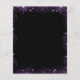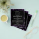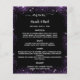 Um cardápio de casamento elegante e glamoroso. Um fundo preto, decorado com brilho falso roxo, faíscas. Texto branco. Personalize e adicione seu nome, datas e o cardápio.