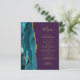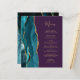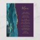 A borda esquerda deste elegante cardápio de casamento moderno apresenta uma borda de ágata em aquarela azul-teal aparada com brilho dourado falso. O texto personalizável combina fontes de caligrafia manuscrita dourada e cobre em um fundo roxo. O verso apresenta um design de ágata azul-teal e dourado correspondente.