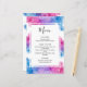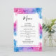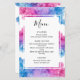 Um cardápio de comida para festa de revelação de gênero do bebê. Em um fundo branco, o design consiste em fumaça azul e rosa elegante que irrompe. Dentro de uma caixa delineada em branco, o texto inclui o cardápio de comida de entrada, prato principal e sobremesa. No verso, o sobrenome do bebê é mostrado dentro de fumaça azul e rosa que cai, seguido pela revelação do gênero, a data do evento ou data prevista para o nascimento do bebê e o nome do casal.