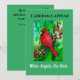 Encontre inspiração com este cartão cardeal significativo. A mensagem esperançosa, "Os cardeais aparecem quando os anjos estão perto", é um versículo baseado na fé e reconfortante. Os observadores de pássaros ficarão encantados com o design de pintura em aquarela que mostra cores vibrantes de vermelho e verde floresta. "Aquietem-se e saibam que eu sou Deus" é a citação bíblica no verso do cartão.