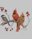 Dois cardeais, um macho e uma fêmea, dividem um cheio de bagas vermelhas maduras com um frango de cabeça negra. Esta ilustração é um dos meus desenhos originais de lápis. Eu adicionei a cor no Photoshop. ~ Copyright © Angela Ewing / My YARDVILLE.