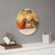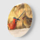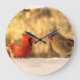 Aqui está um relógio de parede com o Sr. e a Sra. Cardinal Norte. É o outono com uma folhagem gloriosa no fundo, mas a primeira neve caiu para nos dar uma prévia do inverno. Ele é uma cor vermelha brilhante. Ela é laranja, ouro e marrom. Ambos têm cristas e bicos de laranja. Eles são verdadeiramente a realeza dos pássaros do quintal com sua música distintiva e cores adoráveis.