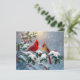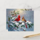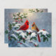 Um par de cardeais vermelhos do norte pousam em um ramo de azevinho coberto com bagas vermelhas e neve.