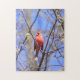 Este quebra-cabeça de serra tem uma fotografia impressa nele de um cardeal norte. Eu tirei esta foto em Nottingham, Maryland. É um cardeal norte vermelho vivo. O Cardeal é o meu pássaro favorito. Esta bela cara está empoleirada num galho numa árvore com belos fundos do céu azul.