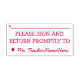 Este simples e amigável design de carimbo contém a mensagem "POR FAVOR, ASSINAR E RETORNAR PROMPTLY PARA", juntamente com uma linha que pode ser escrita acima de uma assinatura ou iniciais. Também apresenta o nome de um educador personalizado. Talvez pudesse ser usado por um professor, educador ou tutor para pedir aos pais ou tutores de um estudante que revissem e reconheçam a marca que um estudante recebeu em um teste, teste, papel ou outra tarefa escolar.