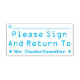 Este design de carimbo básico contém a mensagem "Please Sign And Return To" (Assinar e voltar para), juntamente com uma linha que permite escrever uma assinatura ou iniciais acima. Inclui também o nome de um professor ou educador personalizado. Talvez pudesse ser usado por um professor, educador ou tutor para solicitar que o(s) progenitor(es) ou tutor(es) do(s) aluno(s) revisse o trabalho do aluno em um teste, papel ou outra tarefa.