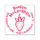 Morango giro volta com endereço de autocolante. Decorado com uma ilustração de morango no meio inferior. Personalizado com nome personalizado em uma fonte divertida no estilo branco e enviando informações por correio impressas em um círculo ao redor da fruta.