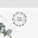 Carimbo de retorno de autocolante circular, concebido por medida personalizada, com uma coroa floral desenhada à mão e nomes de casais, em caligrafia elegante à mão. Perfeito por adicionar um pouco de estilo rústico aos seus convites de casamento, cartas, favores e presentes.