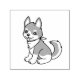 Imagem quadrada cinzenta de um cão rouco sentado com um sorriso feliz, língua para fora. Um simples lenço está amarrado em volta do pescoço.