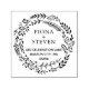 Coroa de folhas botânicas elegantes com nome clássico e tipografia moderna de endereço de devolução.