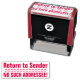 Este simples design de carimbo apresenta as mensagens "Return to Sender" (Retornar ao remetente) e "NO THERSSEE!" (NENHUM DESTINATÁRIO!). Ele pode ser usado para indicar que o correio recebido foi entregue para o endereço errado ou que o destinatário é desconhecido e deve ser devolvido ao remetente.