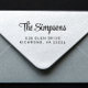 Carimbo de endereço de retorno moderno com seu nome em um script de na moda e seu endereço em uma simples tipografia. Economize tempo e esforço personalizando facilmente seu endereço de retorno. Perfeito para convites de casamento, anúncios de festas, correspondência diária e endereços de negócios.