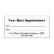 Este selo diz "Sua próxima nomeação" no topo. Há também linhas para a data e hora da nomeação. Há também texto de exibição que você pode editar para criar uma mensagem personalizada, se desejar. A parte inferior tem texto de exibição que você pode editar para o nome do dentista (ou o nome da prática) e o número de telefone. Todo o texto pode ser editado ou excluído.